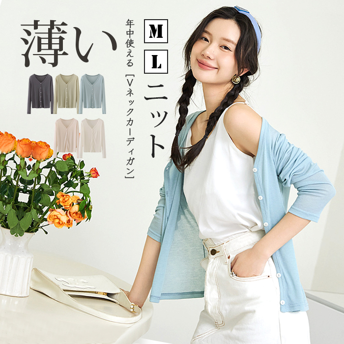 真夏日や酷暑でも使える、風をまとったような超薄手 サラッとカーディガン コーディネートに合わせ楽チン 涼やかな素材感を定番シルエで仕上げたVネックサマーニットカーディガン