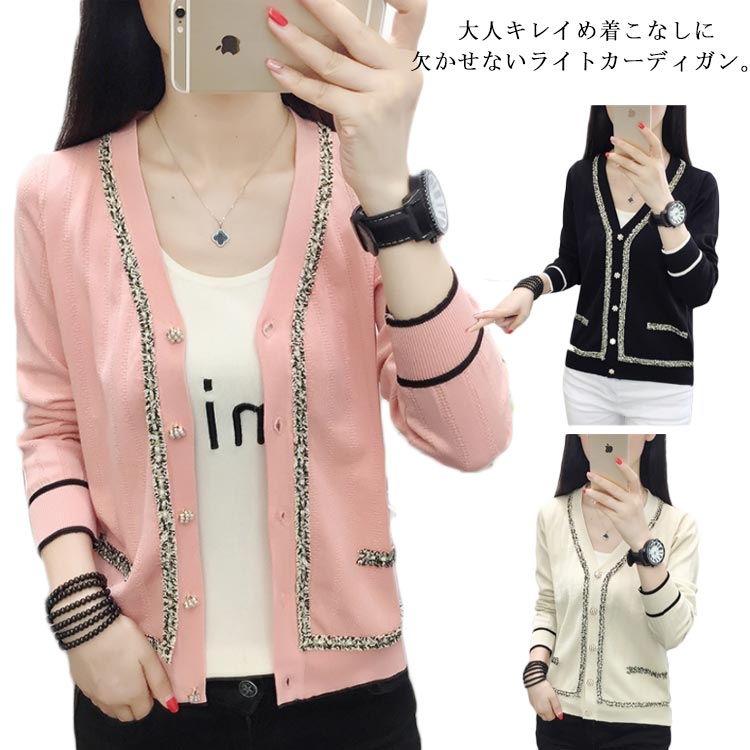 カーディガン レディース 春 ニット 長袖 金ボタン ライン vネック トップス コンパクト 大人 ベージュ ピンク 黒 ブラック 春夏 羽織り