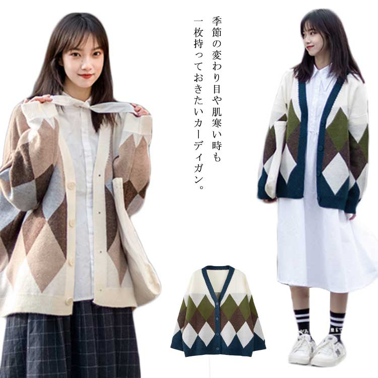 カーディガン アーガイル 春秋 ニットカーディガン 厚手 羽織り Vネック ゆったり 体型カバー 前開き 通勤 通学 普段着 お洒落 リラック