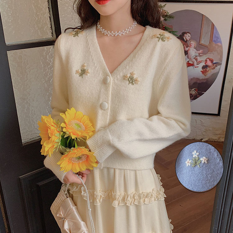 カーディガン カットソー レデイース トップス お出かけ ニット 春秋 長袖 ショート丈 同窓会 普段着 着やせ 刺繍 おしゃれ 可愛い カジュアル ブルー オフホワイト -048