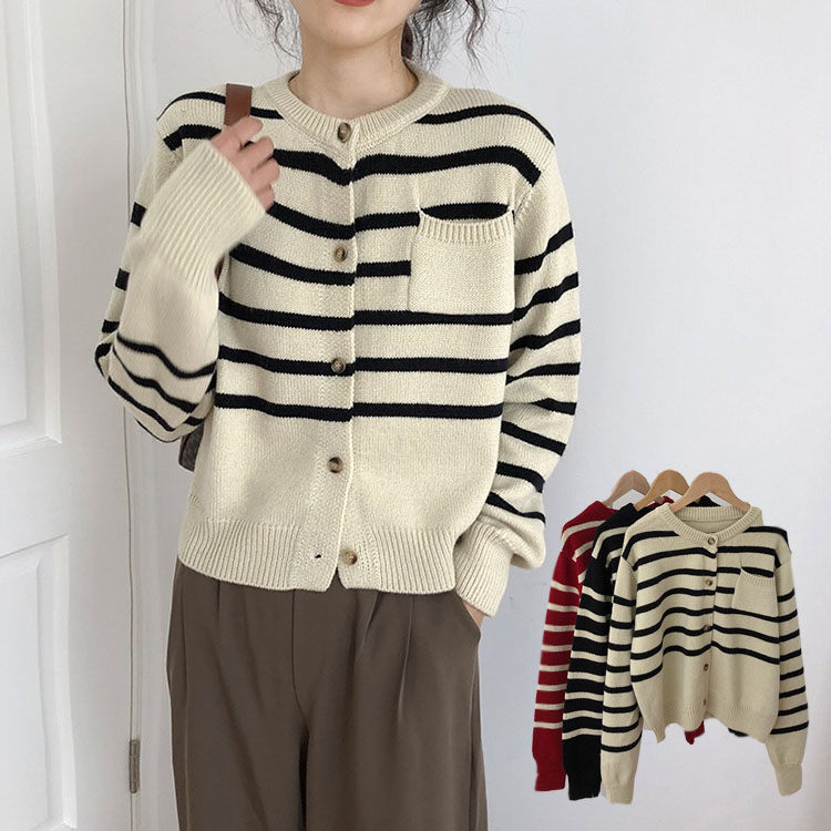 カーディガン レデイース トップス おしゃれ 可愛い ブラック オフホワイト レッド ストライプ カジュアル お出かけ ニット 春秋 長袖 ショート丈 体型カバー 同窓会 普段着 着やせ ボーダー