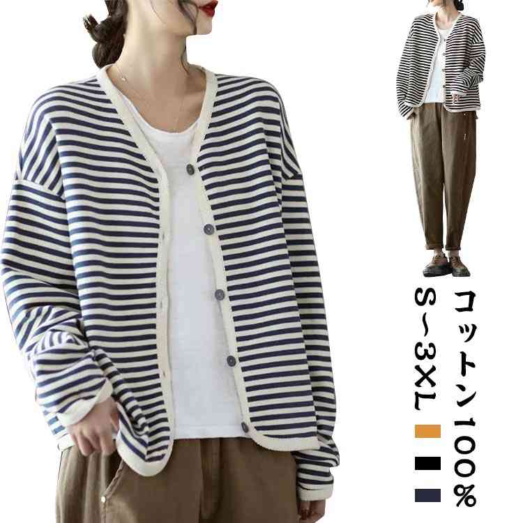 カーディガン 秋 綿100% 大きいサイズ レディース Vネック 長袖 トップス ゆったり 秋 コットン 羽織り