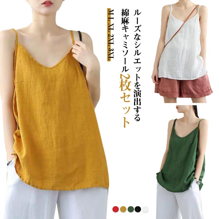 ~3 キャミソール 2枚セット 綿麻 肌着 通気性 サラサラ 快適 部屋着レディースファッション トップス キャミソール