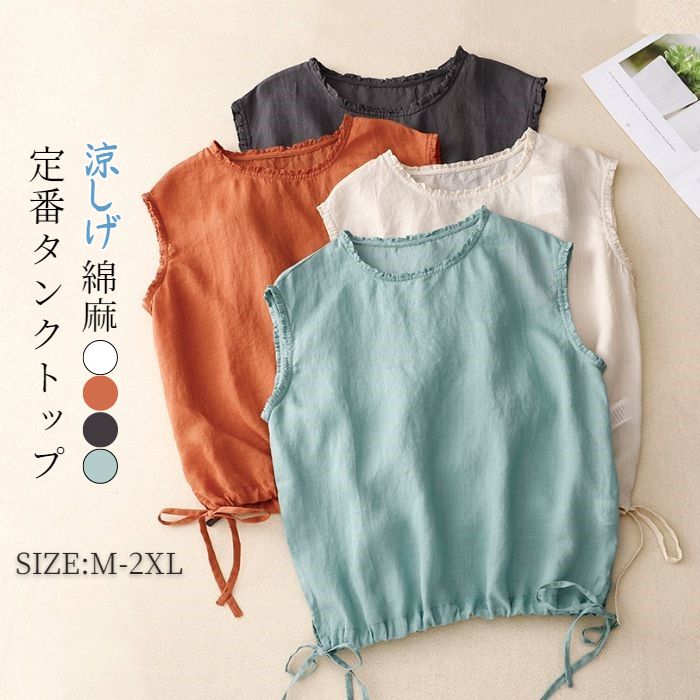 タンクトップ トップス レディース シャツ シャツブラウス 春 夏 袖なし シャツ クルーネック ノースリーブ 重ね着 綿麻 リボン ドローストリング コットンリネン ゆったり 大きいサイズ 体型カ