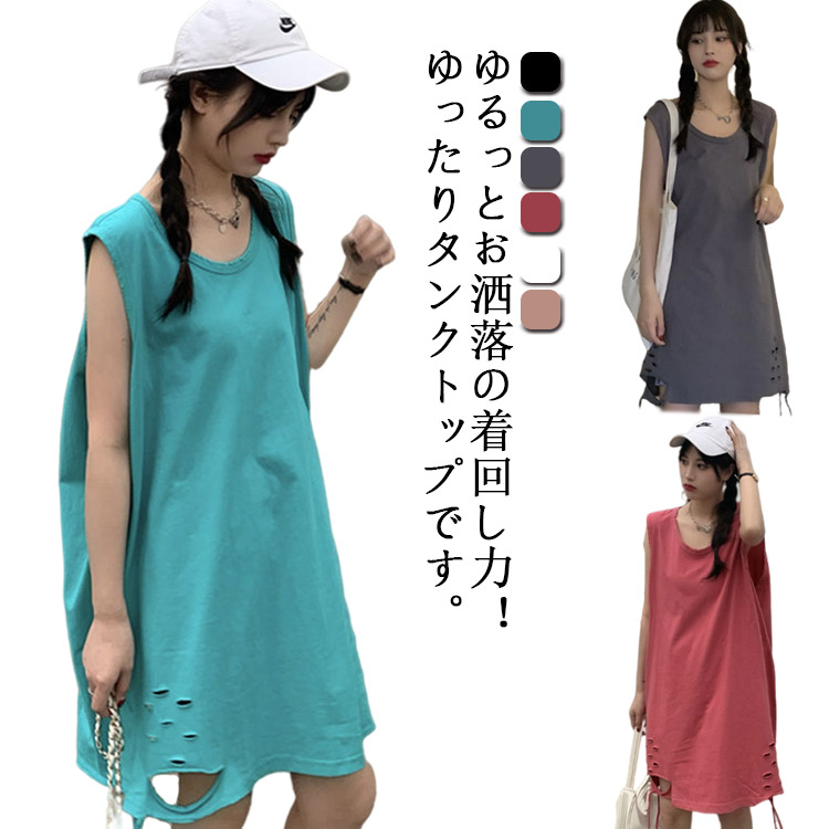 体型カバー トップス ロング丈 レディース インナー ラウンドネック タンクトップ 裾ダメージ カジュアル 原宿系 レイヤード