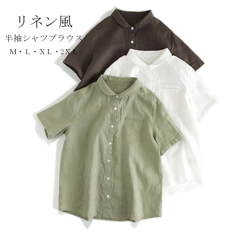 半袖シャツ トップス レディース ブラウス シャツブラウス 半袖 リネンシャツ 無地 白シャツ 折襟 ショート丈 前開け シンプル 綿シャツ 丸襟 コットン 綿麻 夏