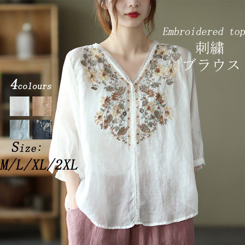 好評シャツ チュニック Tシャツ 夏 半袖 ブラウス プルオーバー 刺繍 シャツ ブラウス 刺繍 春夏 胸元の繊細な刺繍が大人フェミニンなブラウス 涼しい 通気性 通勤 涼しい