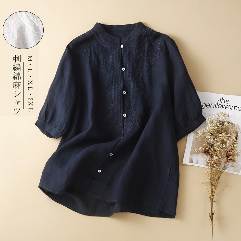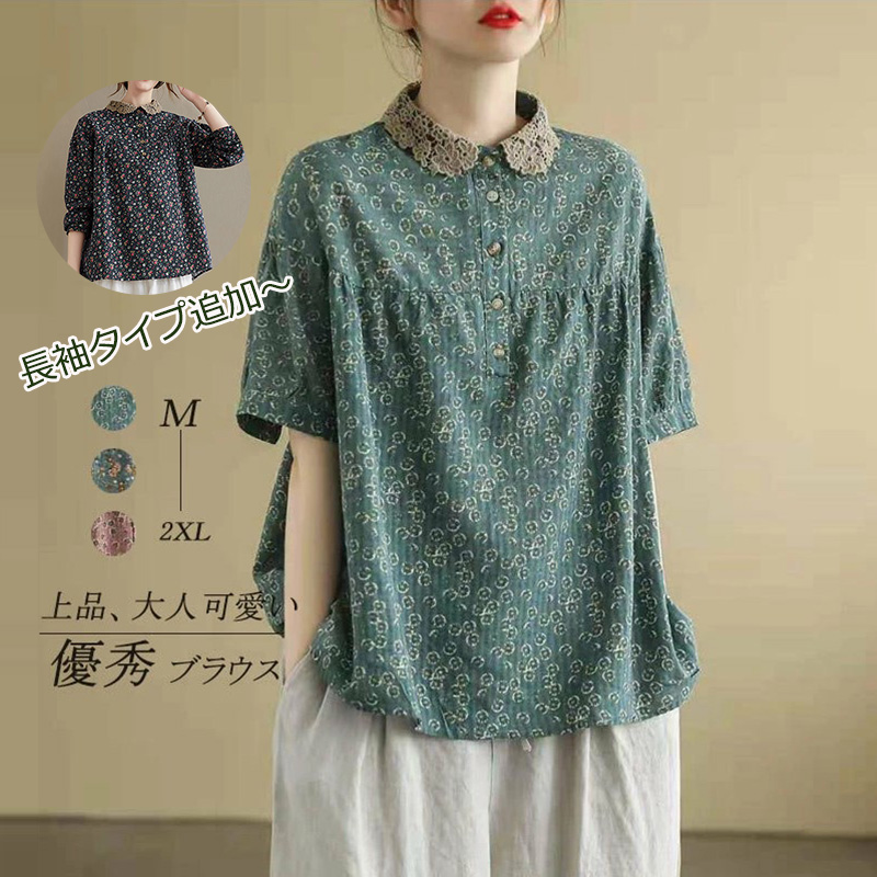 ブラウス レース 半袖 夏 半袖シャツ レディース シャツ 襟付き 大きいサイズ 花柄ブラウス tシャツ プ 綿麻 リネン トップス