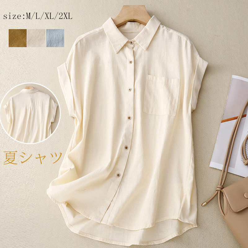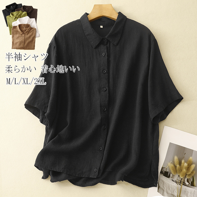 半袖シャツ トップス レディース ブラウス シャツブラウス 半袖 リネンシャツ 無地 白シャツ 折襟 ショート丈 前開け シンプル コットン 綿麻 夏