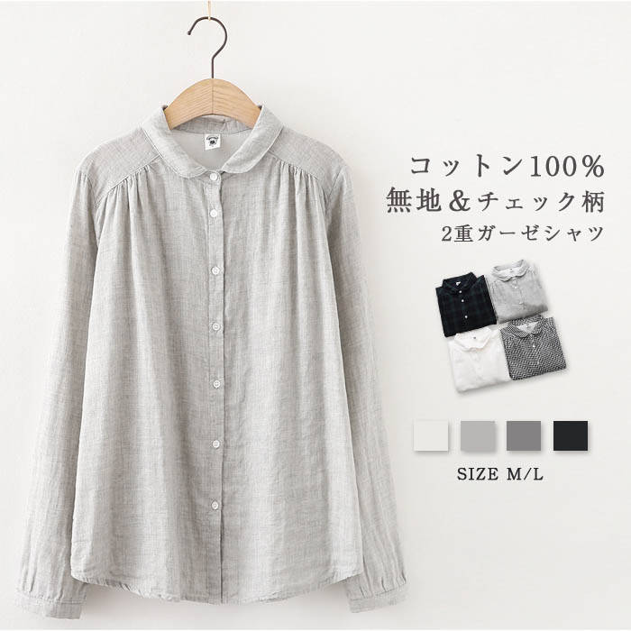 ガーゼ シャツ 綿100% 春 シャツブラウス レディース 丸襟 ブラウス 長袖 ガーゼシャツ トップス ギャザー カジュアル 無地 チェック 切り替え 羽織り