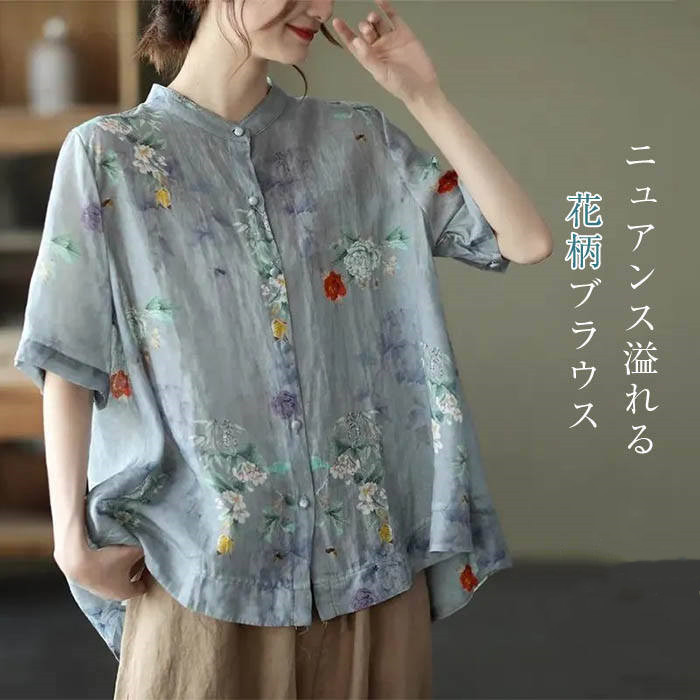 総柄 リネン シャツブラウス レディース 半袖 シャツ ブラウス 綿麻混 オフィス 大きいサイズ 花柄 個性的 リネンシャツ バンドカラー ゆったり