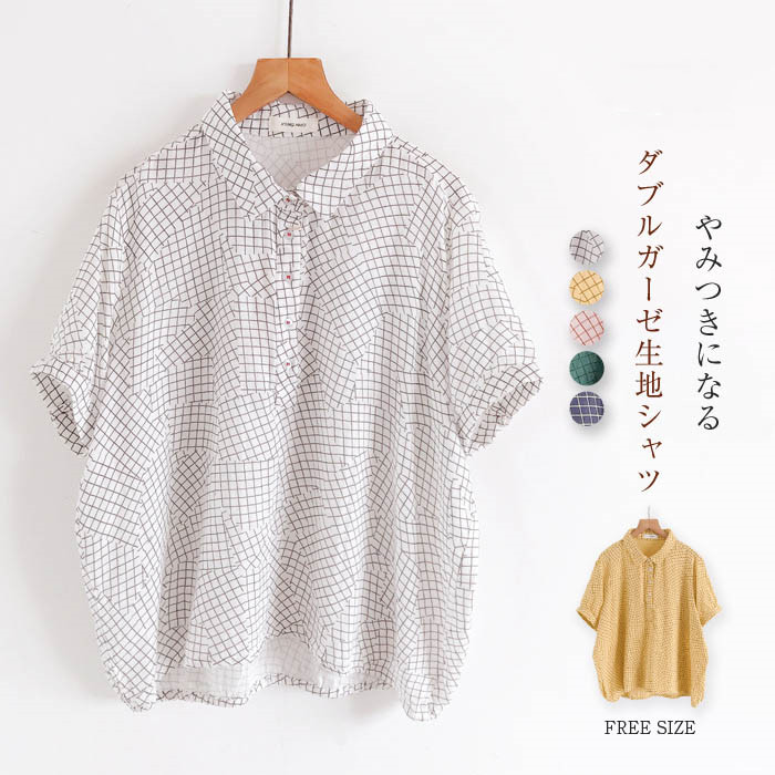 ダブルガーゼ 綿100% シャツブラウス レディース 夏 ガーゼシャツ シャツ ブラウス 半袖 トップス 綿 カジュアル トップス チェック ゆったり ゆる