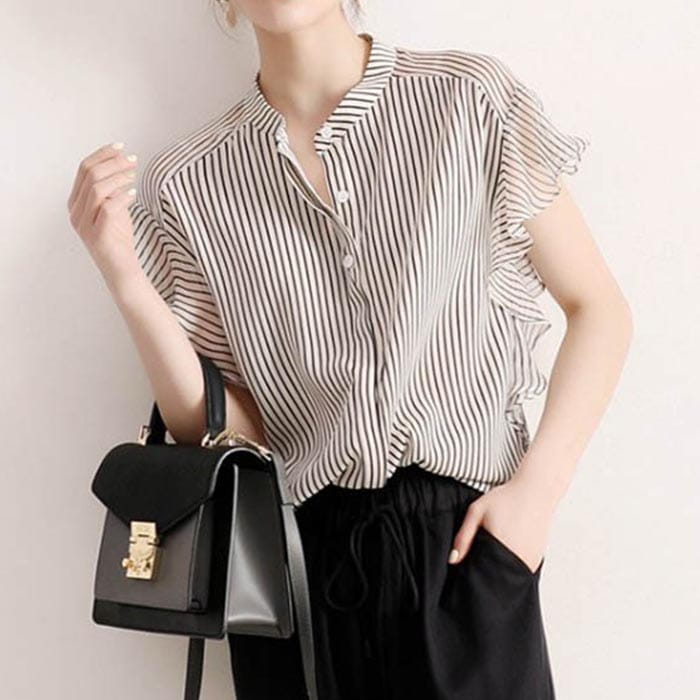 ブラウス シャツ ストライプ ノーカラー フレンチスリーブ シースルーブラウス フレア 夏 薄手 シフォン 20代 30代40代