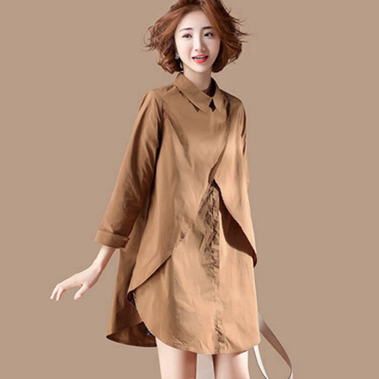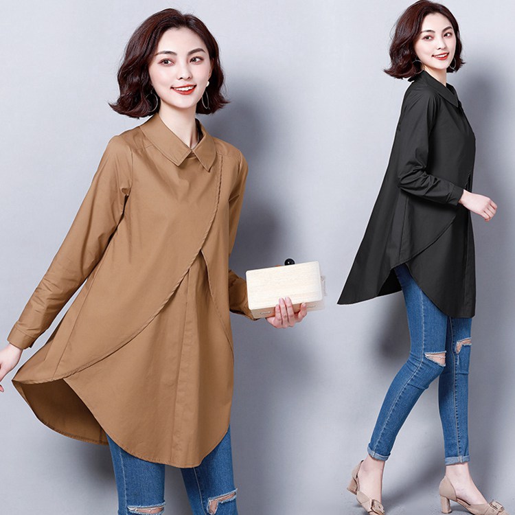 シャツワンピ シャツ ブラウス レディース 秋 長袖 膝丈 折り襟 重ね風 無地 着痩せ 体型カバー ライン トップス チュニック お洒落 通勤 20代 30代 40代