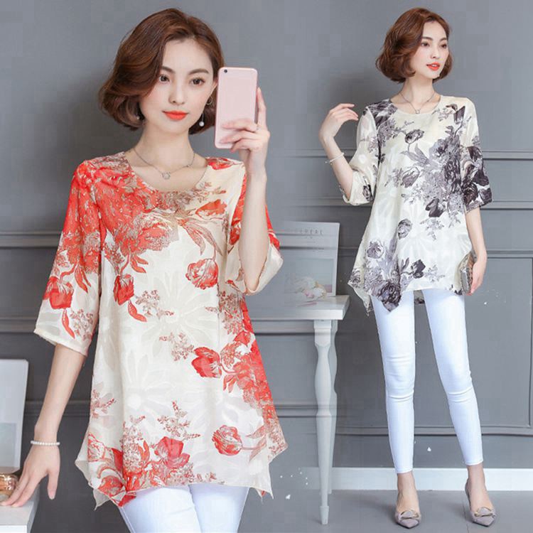 レディース Tシャツ シフォン ブラウス ロング丈 チュニック 花柄 カットソー トップス シフォンブラウス 体型カバー 大きいサイズ ゆったり