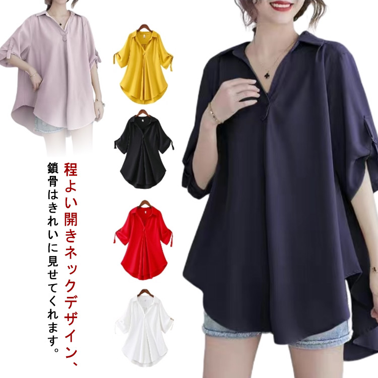 ゆったり ~6 体型カバー 通勤 ロングブラウス 大人 女性 薄手 5分袖レディースファッション トップス シャツ ブラウス