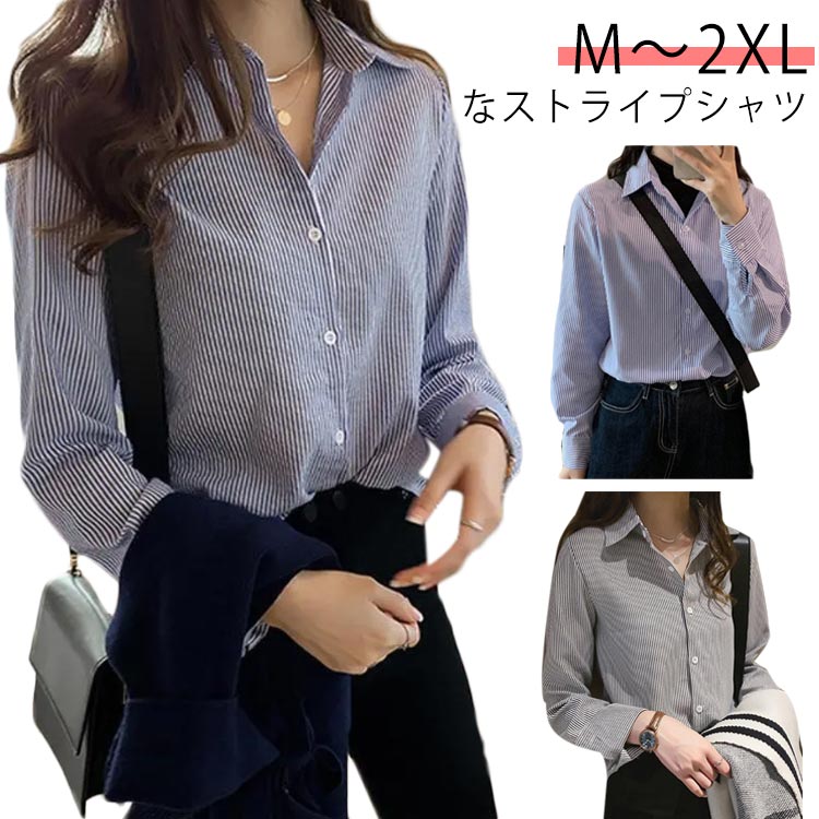 M~2XL 大人女性 長袖 薄手 ストライプシャツ OL きれいめ M~2XLレディースファッション トップス シャツ ブラウス