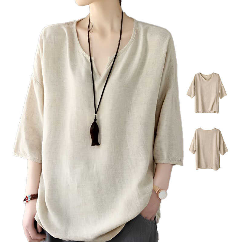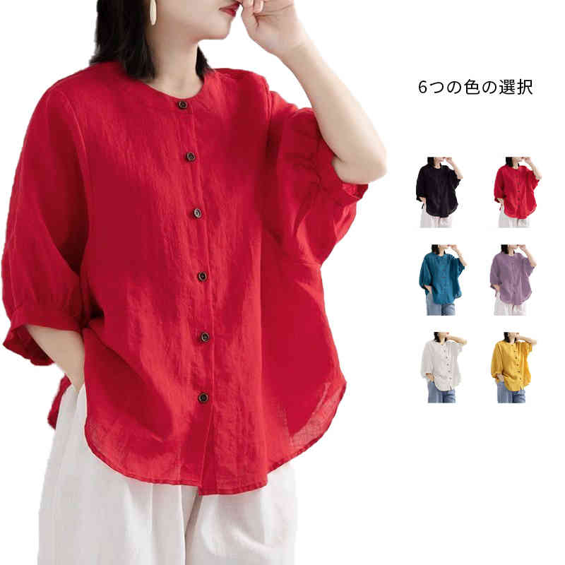 カジュアル シャツ サマートップス 夏物 無地 5分袖 綿麻 体型カバー オフィス スーツインナーレディースファッション トップス シャツ ブラウス