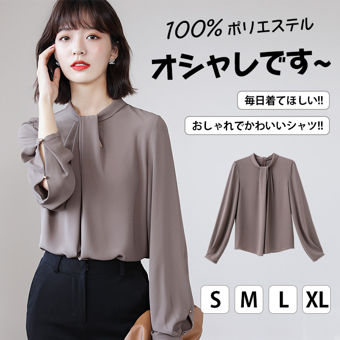 シワになりにくいサテン素材 清新 オフィスウェア きれいめ 通勤 カジュアルにもエレガントにも着回ししやすいスッキリしたブラウス ノーアイロン
