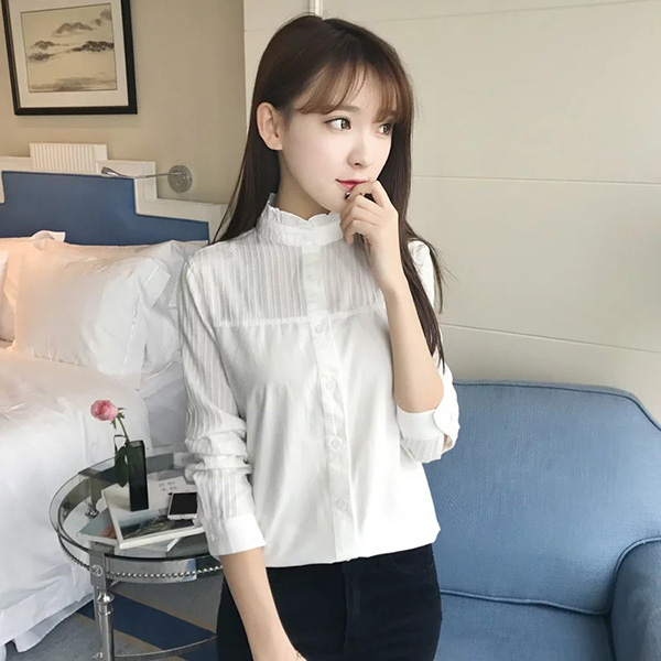レディースブラウス 長袖 ブラウス シャツ 素敵な色とデザイン スタンドカラーと胸元の切替がクラシカルな白シャツ