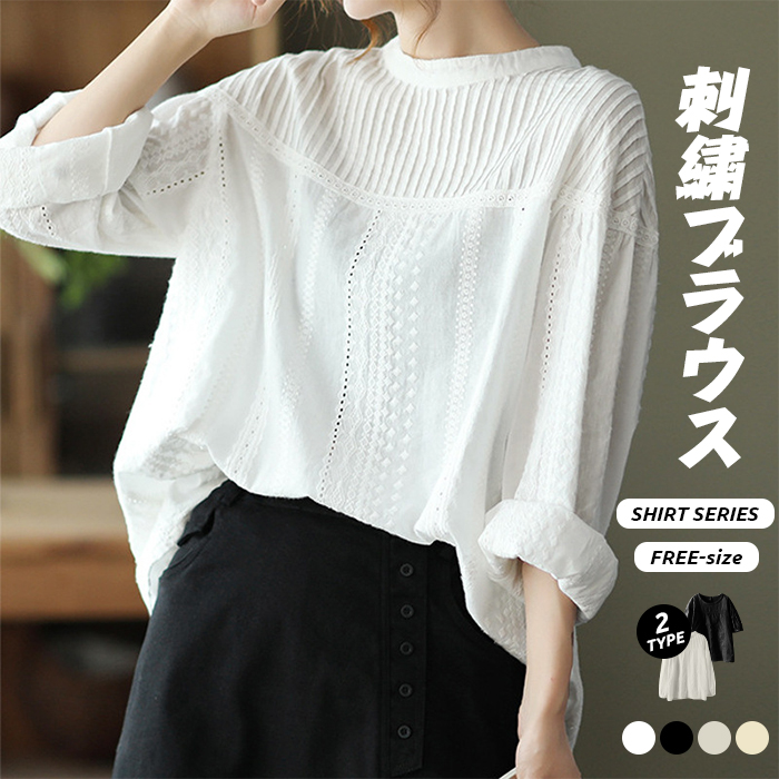 お洒落な花刺繍のシャツ ブラウス 大人トップス シャツ ブラウス オトナ 可愛い おしゃれ レディース シャツ ホワイト ブルー