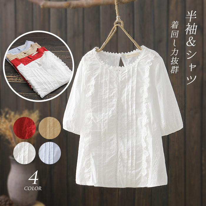 ナチュラル ブラウス シャツ 半袖 トップス ハート柄 夏 レディース ショートカラー 大人 女子 可愛い お洒落 女子 洒落