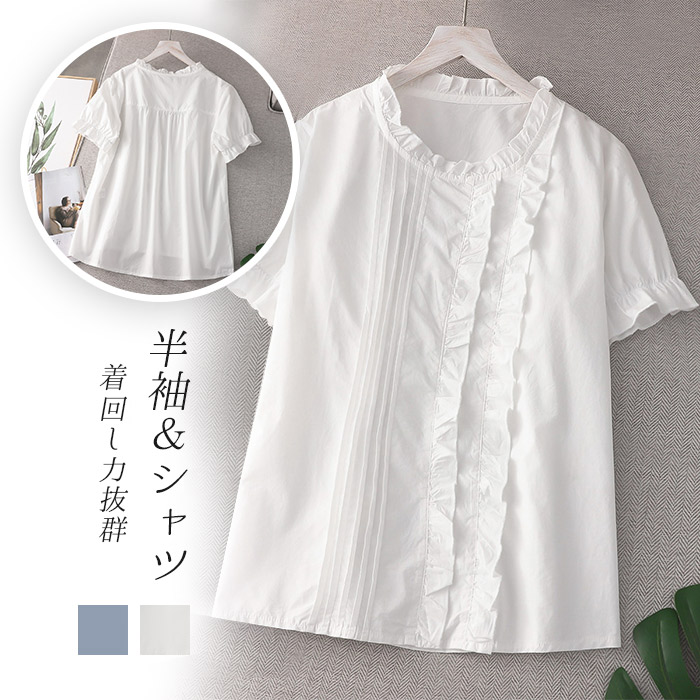 レディースブラウス 半袖 ブラウス シャツ 素敵な色とデザイン スタンドカラーと胸元の切替がクラシカルな白シャツ