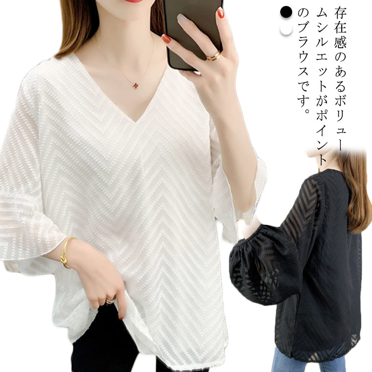 ブラウス レディース 半袖 シフォン トップス 長袖 キレイめ Vネック ゆったり 体型カバー お洒落 無地 春秋物 通勤 フェミニン 大きいサイズ