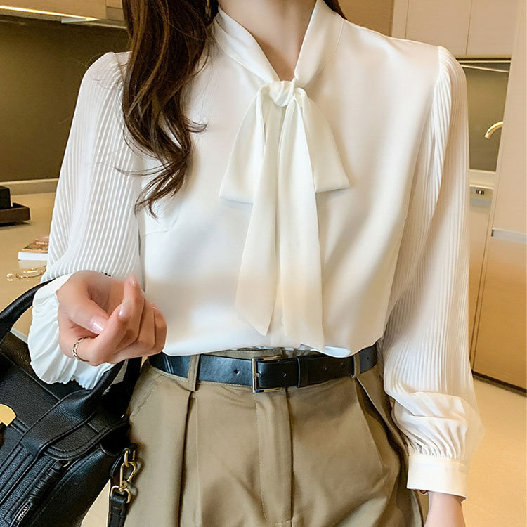 シャツ 無地 シフォン レデイース トップス おしゃれ ホワイト ブラウス 春秋 長袖 蝶結び 高級感 エレガント 同窓会 普段着 着やせ フォーマル 通勤 優雅 発表会 結婚式 -054