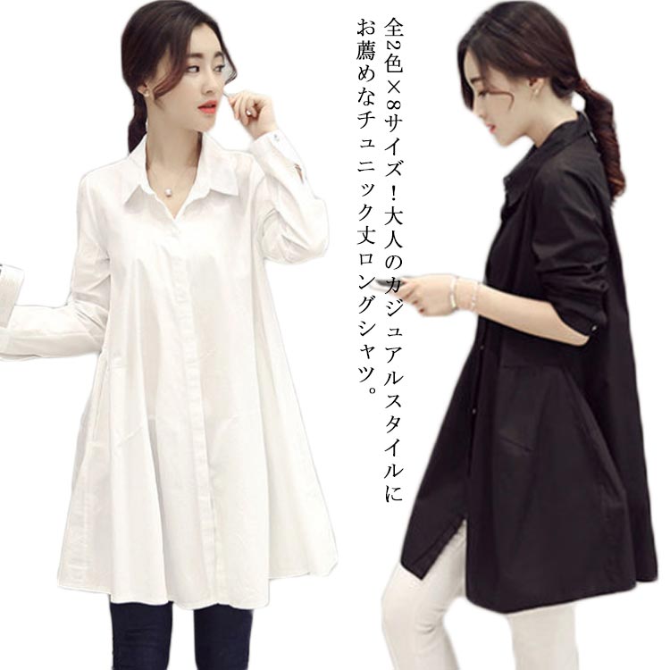 ロングシャツ フレアトップス ブラウス ロング丈 Aライン 体型カバー シンプル 無地 ホワイト ブラック 長袖 春 秋 白シャツ レディース チュニック