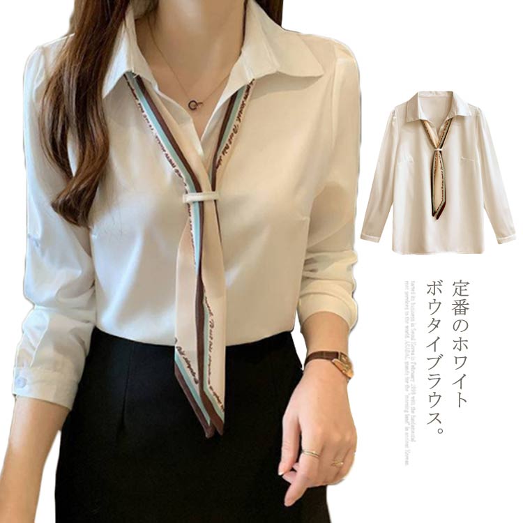 ホワイト リボンシャツ ワイシャツ 長袖 ボウタイ 女性 カジュアル 春秋 大人 可愛い おしゃれ シャツ 事務服 トップス