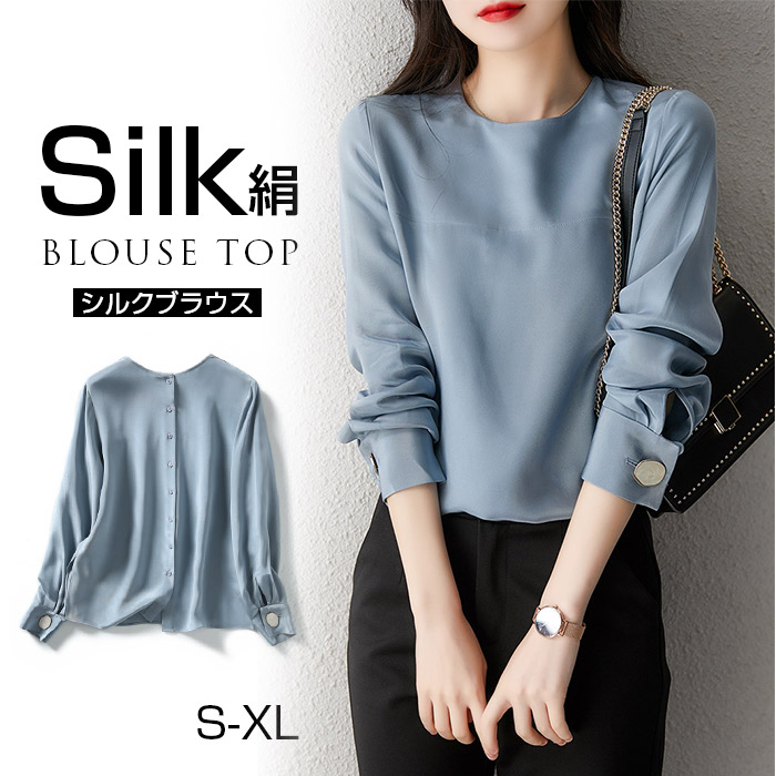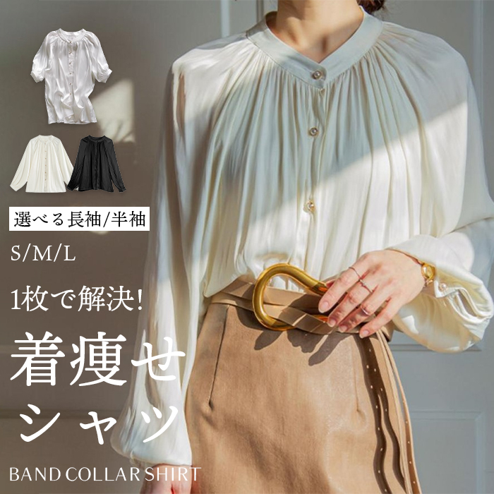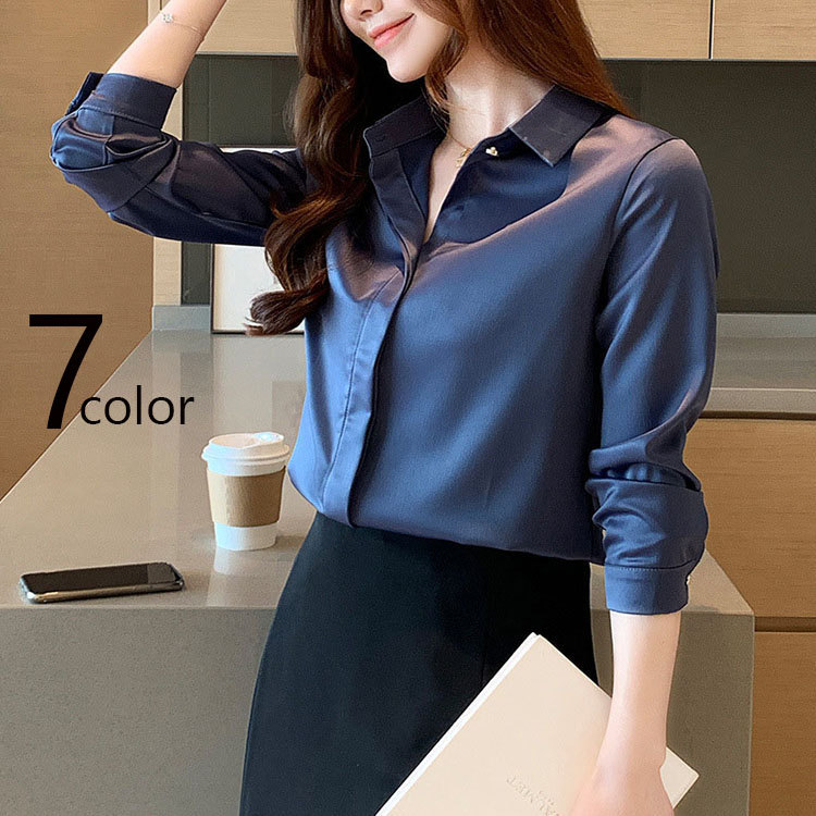 シワになりにくいサテン素材 清新 オフィスウェア きれいめ 通勤 カジュアルにもエレガントにも着回ししやすいスッキリしたブラウス ノーアイロン