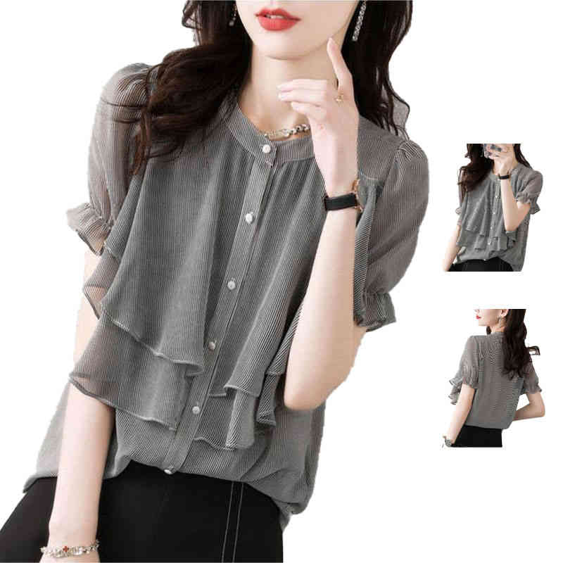 おしゃれブラウス ストライプブラウス フリルブラウス 半袖 シフォン シャツブラウス 丸襟 おしゃれ