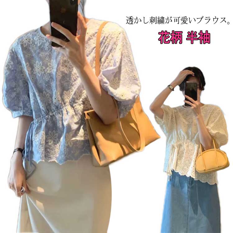 ブラウス レディース トップス 透かし 刺繍 花柄 半袖 Uネック ボリュームスリーブ ボリューム袖 ギャザー 切替 おしゃれ 可愛い カジュアル 着痩せ 通勤 お出かけ