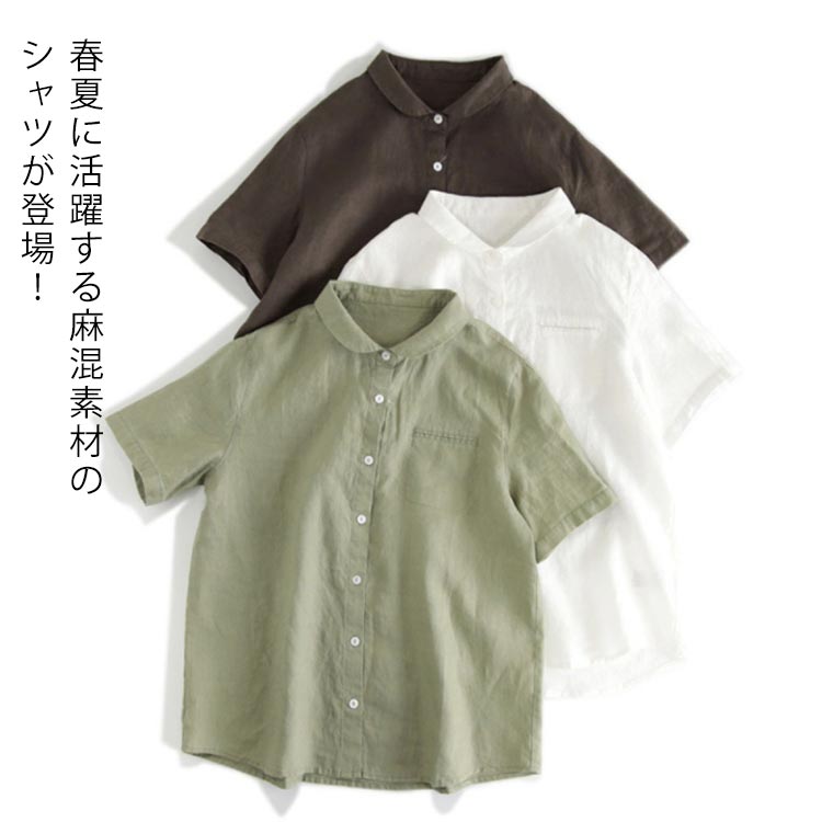 シャツ レディース 綿麻シャツ 半袖 リネンシャツ リネン混 麻混 綿麻 半袖シャツ 涼しい 薄手 夏シャツ 襟付き 折り襟 トップス 大きいサイズ カジュアル オフィス 無地 可愛い ナチュラル シ