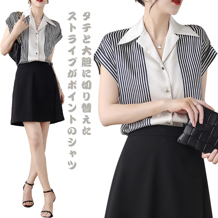 開襟シャツ ストライプ柄 切り替え 半袖シャツ バリモアカラーレディースファッション トップス シャツ ブラウス