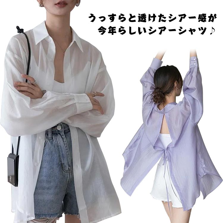 シアーシャツ 長袖 レディース バックスリット シースルー トップス 透け感 シャツ ロングシャツ 薄手 涼しい ゆったり 体型カバー 羽織り 日焼け対策 冷房対策 カジュアル おしゃれ かわいい き