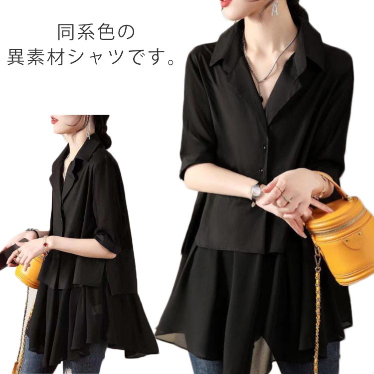 シャツ 異素材 切り替え 襟付きシャツ レディース 半袖 五分袖 トップス ブラウス 抜き襟 ミドル丈 ふんわり チュール切替 レイヤード風 重ね着 シンプル 無地 ゆったり 体型カバー カジュアル