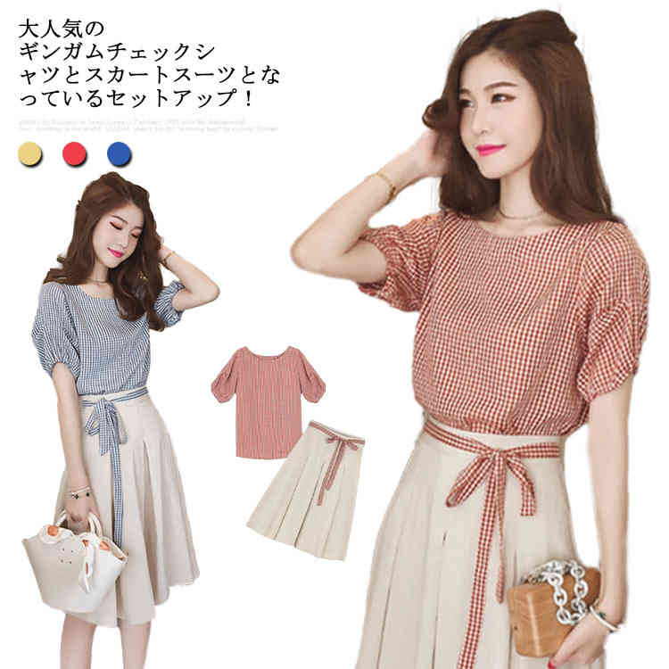 セットアップ レディース 夏 チェック柄シャツ ブラウス スカート 膝丈 大人 上品 スリムレディースファッション トップス シャツ ブラウス