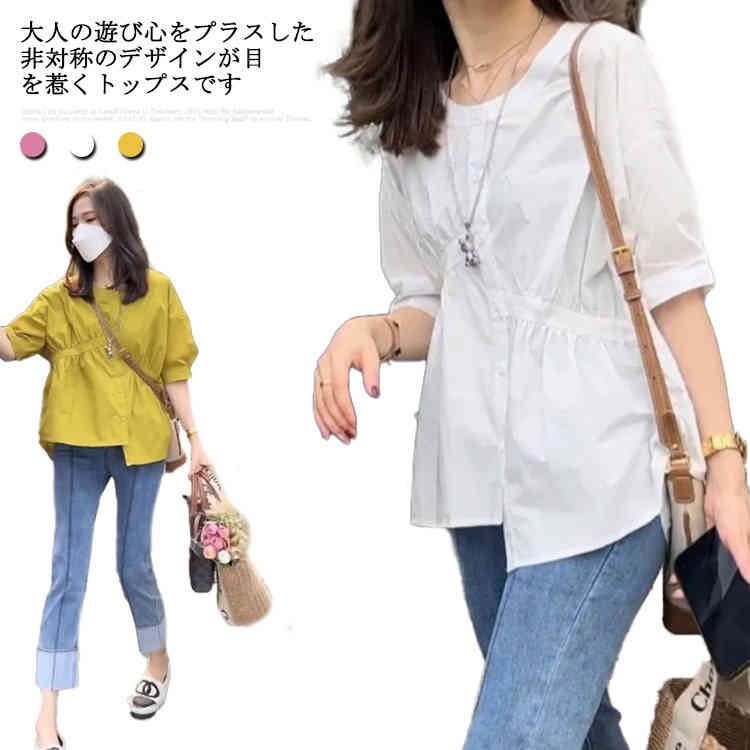 5分袖シャツ プルオーバー カジュアルシャツ レイヤード シャツ ブラウス トップス シンプル 体型カバー
