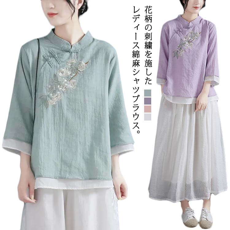 綿麻 レディース レトロ リネンブラウス リネン混 花柄 チャイナシャツ 薄手 七分袖 スタンドカラー チャイナボタン チャイナ風