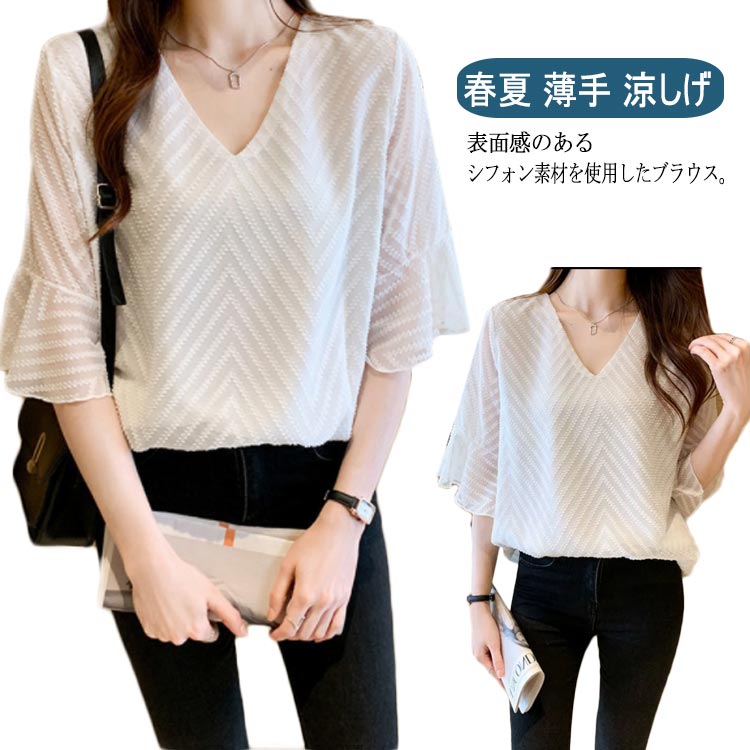 シフォン ブラウス レディース 半袖 フレア袖 Vネック 春夏 可愛いレディースファッション トップス シャツ ブラウス