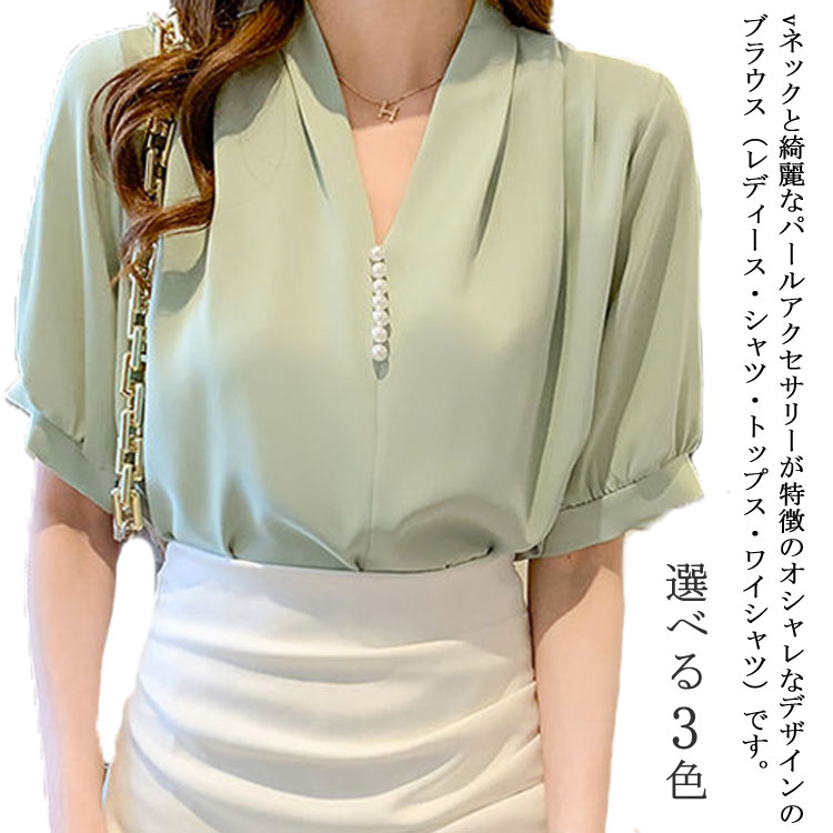 卒園式 シフォン レディース プルオーバー シャツ 半袖 ブラウス トップス 夏 インナー 通勤 普段着 お出掛け ゆったり 入学式 ホワイト グリーン 春 ベージュ 大きいサイズ カジュアル Vネッ