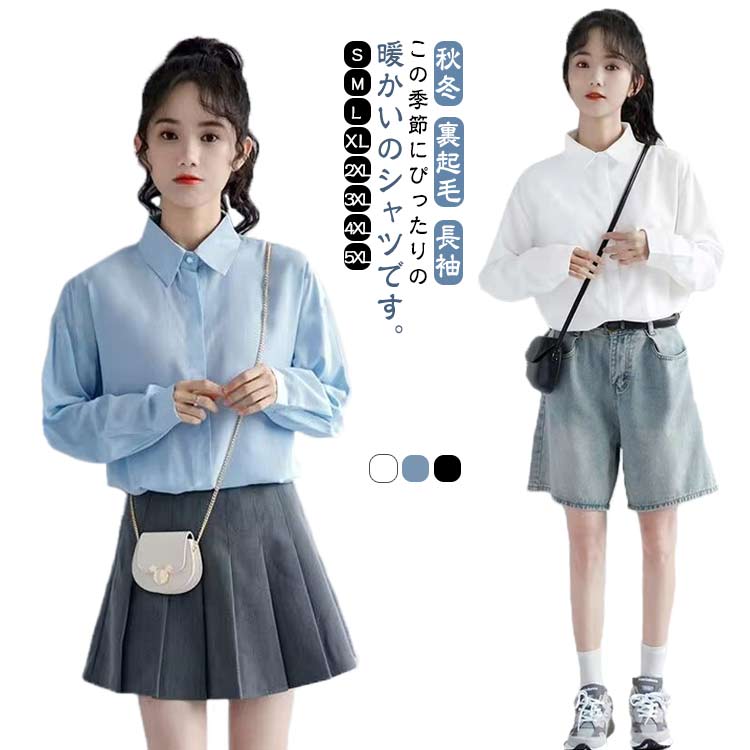 ワイシャツ ボア付き レディース トップス シャツ 暖かい 裏ボア 裏起毛 長袖シャツ ブルゾン ボタンアップ おしゃれ カジュアル きれいめ 無地 白 黒 青 ホワイト ブラック