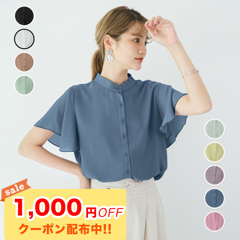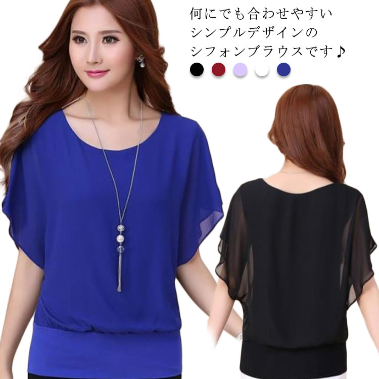 シフォントップス ブラウス レディース 半袖 フリル袖 フレアスリーブ ふんわりスリーブ クルーネック 全5色 夏 無地
