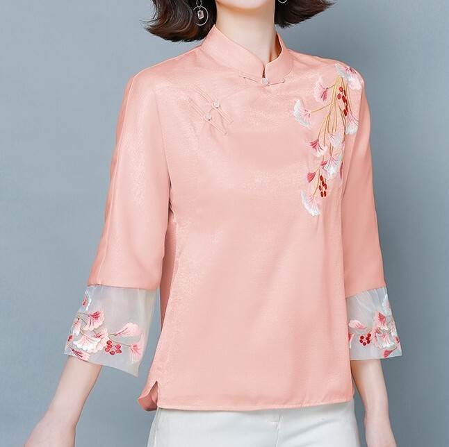 前開き 春夏 シャツ 花柄 チャイナボタン チャイナ ブラウス 七分袖 トップス ネック ネック チャイナー風 チャイナ服 太極拳 漢服 レイヤード シフォン ステージ ダンス 二胡 箏 演奏服