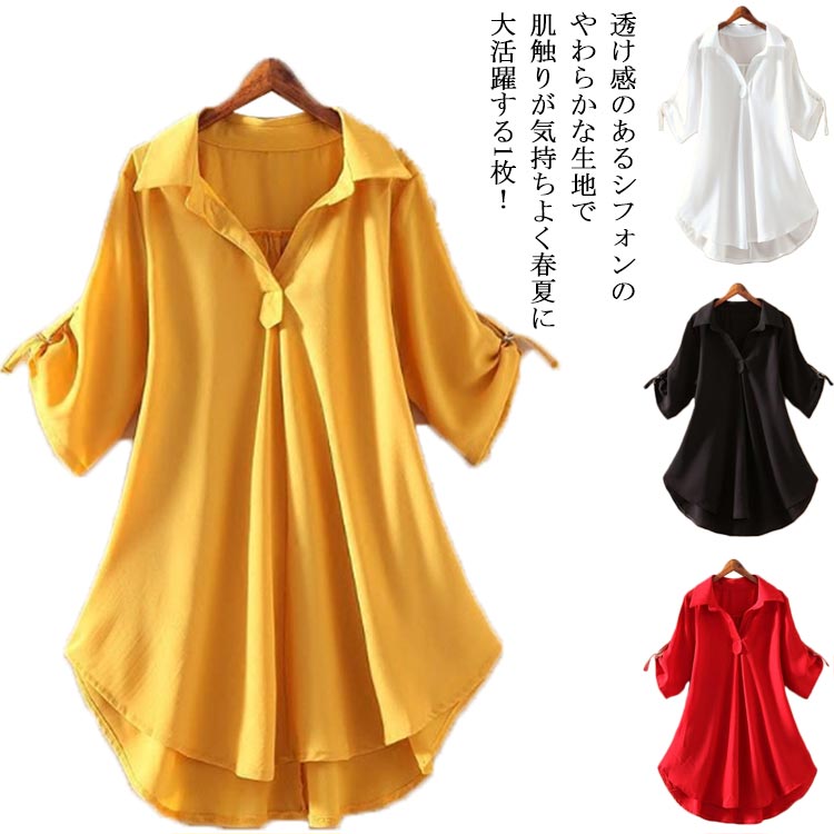 スキッパーシャツ ブラウス スキッパー トップス レディース ロールアップ シフォン 無地 ホワイト 春 夏 レッド イエロー シャツ