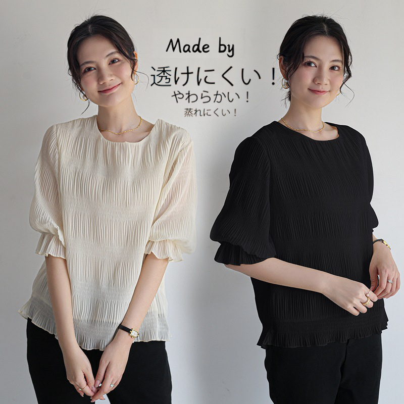 身頃に裏地付きが嬉しい 袖部分はシフォンの透け感 たっぷりシャーリングが大人可愛いシフォンブラウス♪