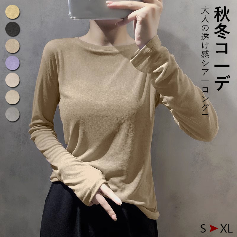 シアートップス tシャツ 長袖 ップス シアー レイヤード インナー 白 無地 トップス クルーネック 透け感