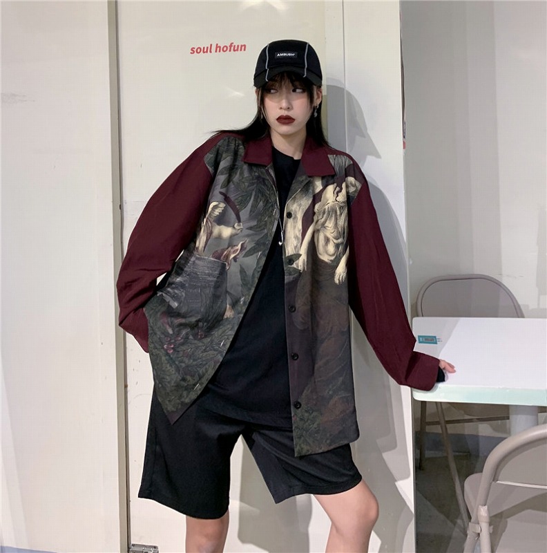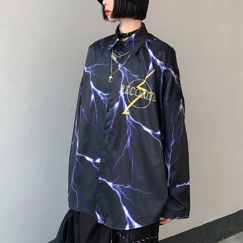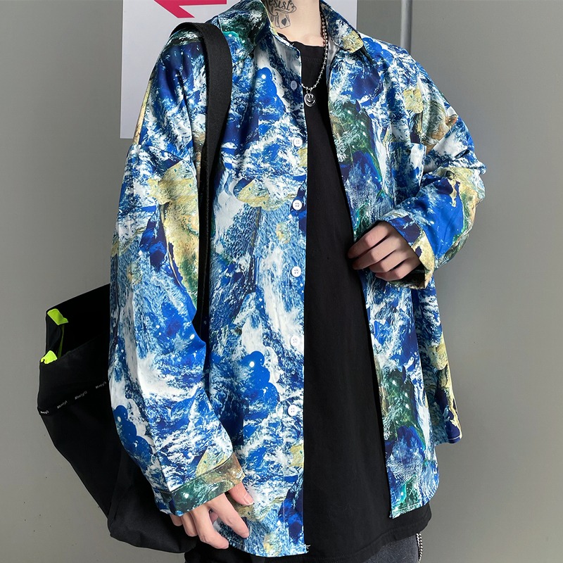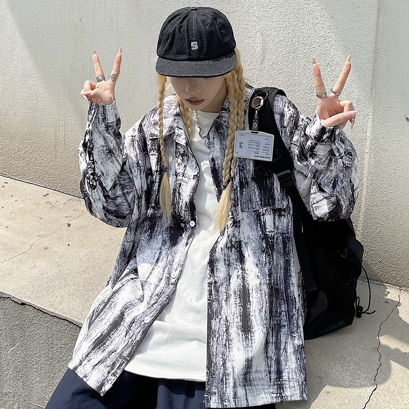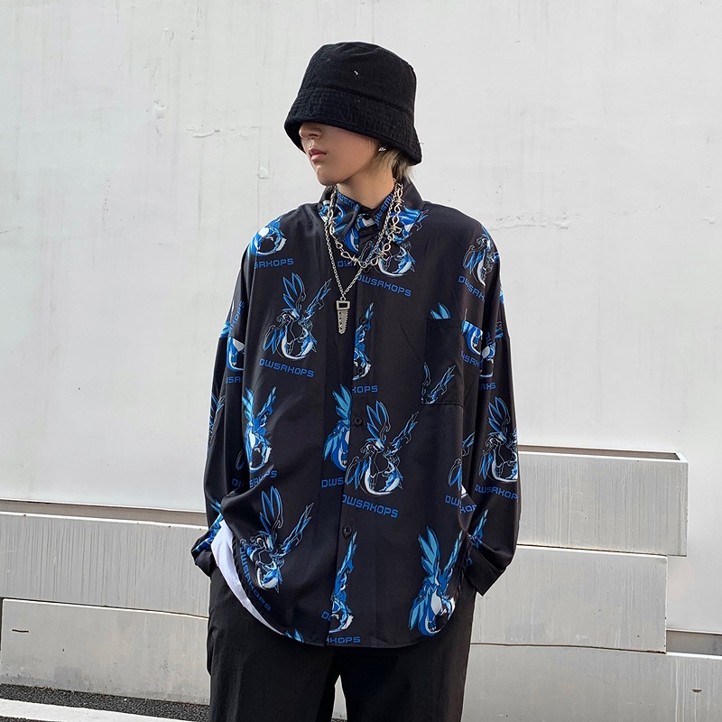 ブラウス シャツ 長袖 切り替え バイカラー 配色 プリント ユニセックス 男女兼用 体型カバー 原宿系ファッション 韓国風 ダンス衣装 カワ 個性 奇抜 かわいい 青文字系 トップス レディ